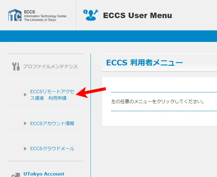 3. 左側のメニューから,「ECCSリモートアクセス環境 利用申請」を選択してください.