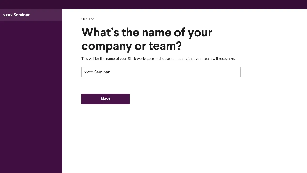 - Set up the workspace (e.g. class name). The “company or team name” will be the name of the workspace. It is recommended that you use a workspace name that makes its purpose easily recognizable (e.g. which class the workspace is for). In this example, the workspace is named “xxxx Seminar”.