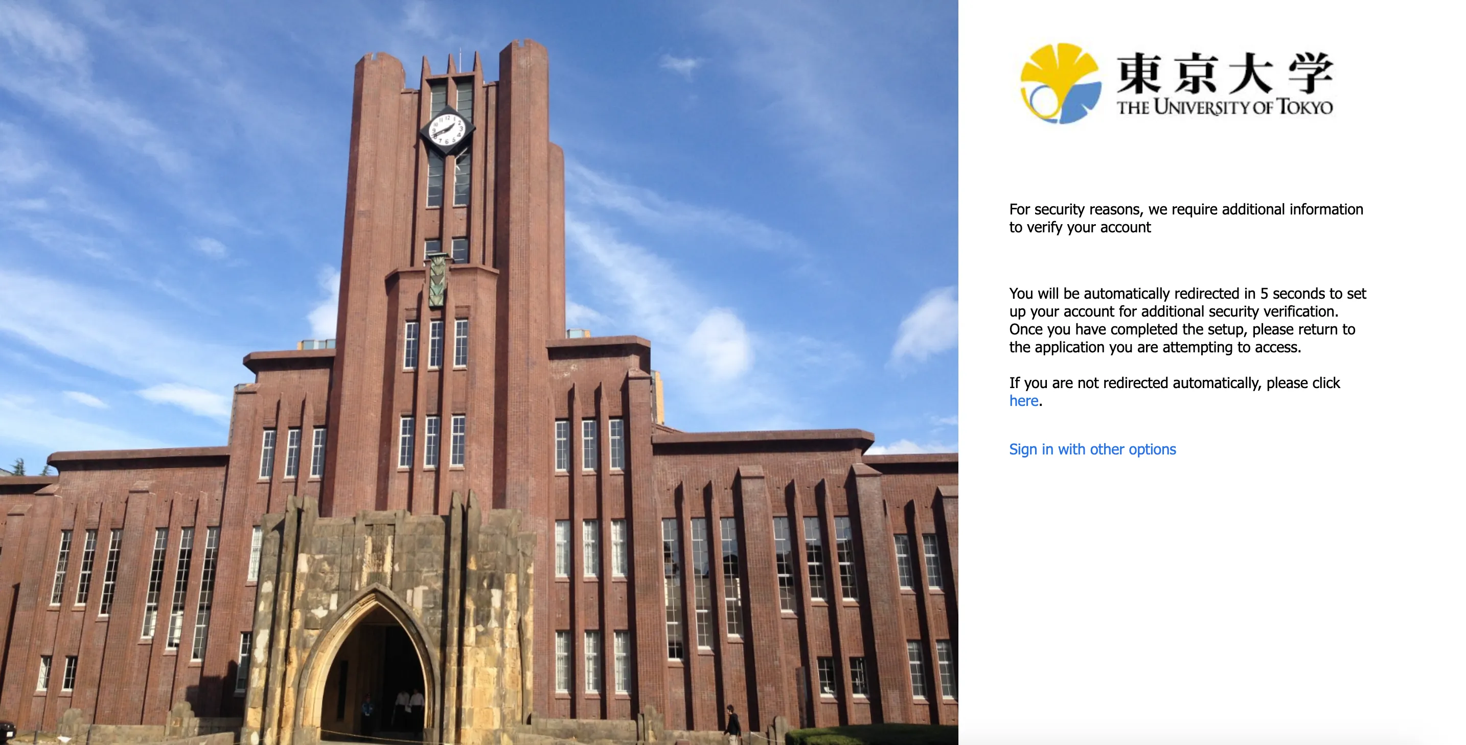 When you sign in to the UTokyo Account, you may receive a “For security reasons, we require additional information to verify your account” error as in the image above depending on the MFA setting. This may occur when you apply for MFA use (Step 4) before setting up the verification methods (Step 1, Step 2) in the initial setup procedures of MFA. Please register the verification methods by following the procedures in “Step 1: Set Up the First Verification Method” and “Step 2: Add Alternative Verification Methods”.