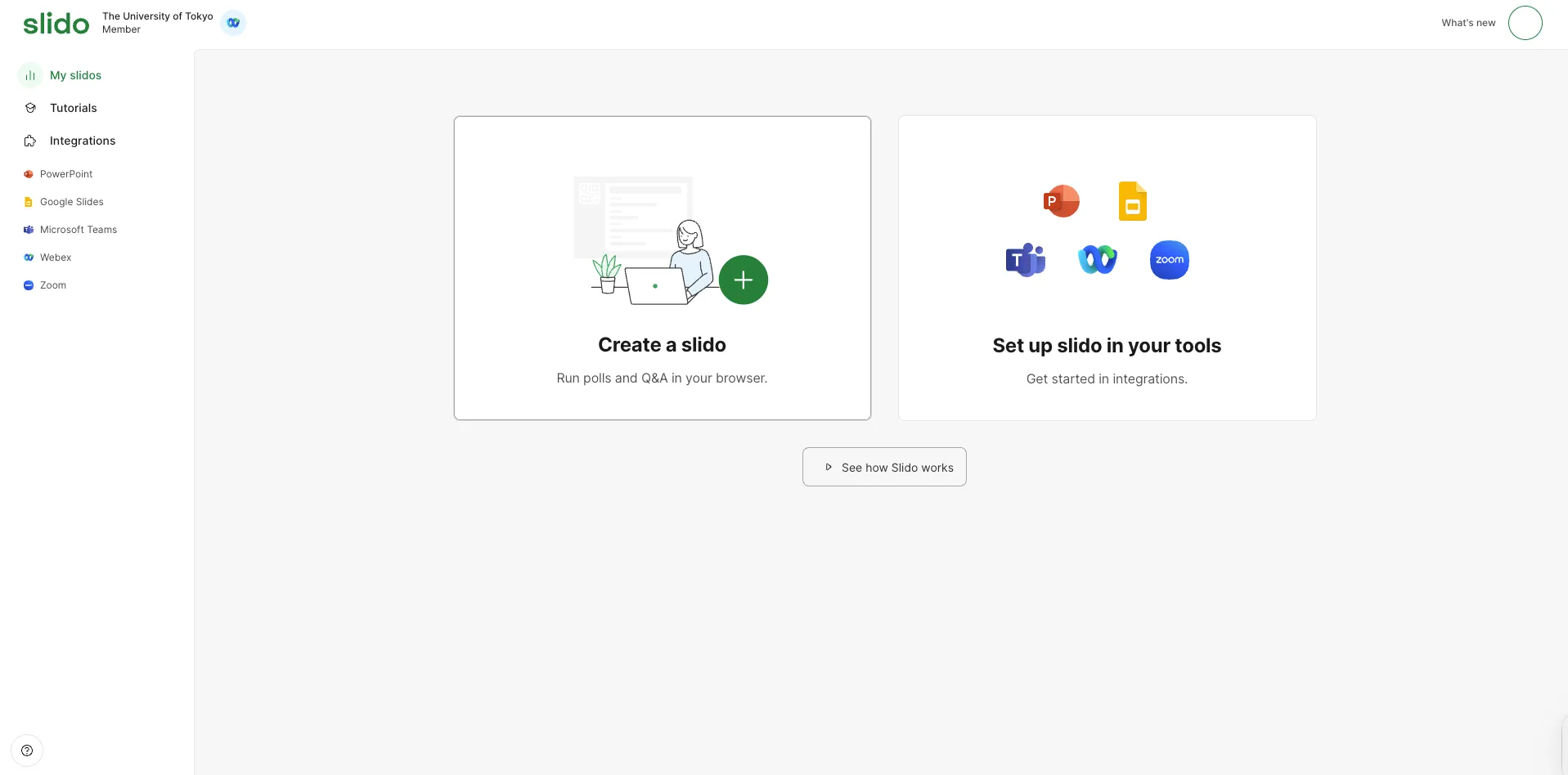 - Slidoは無料でも使うことができますが,東京大学のアカウントでサインインすることで,さまざまな機能を追加で使えるようになります.授業でSlidoを利用する場合には,東京大学のアカウントでサインインすることをおすすめします.