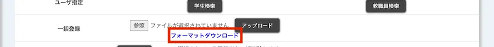 - 「一括登録」欄から青文字の「フォーマットダウンロード」を押して,コース参加者登録用のExcelファイルフォーマットをダウンロードしてください.