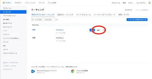 • 操作したいミーティングにカーソルを合わせ,表示される「編集」ボタンを押すと,「『(ミーティング名)』を編集する」という画面になります.
